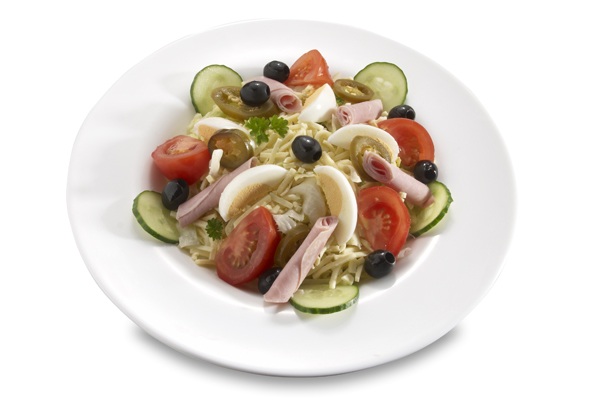 mit Eisbergsalat, Gurken, Tomaten, Zwiebeln, Schinken, Käse, gekochtes Ei und...