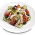 mit Hähnchenstreifen, Champignons, Gurken und Eisbergsalat