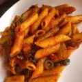 Mit Tomatensoße, peperoncino (scharf), Knoblauch und Olivenöl